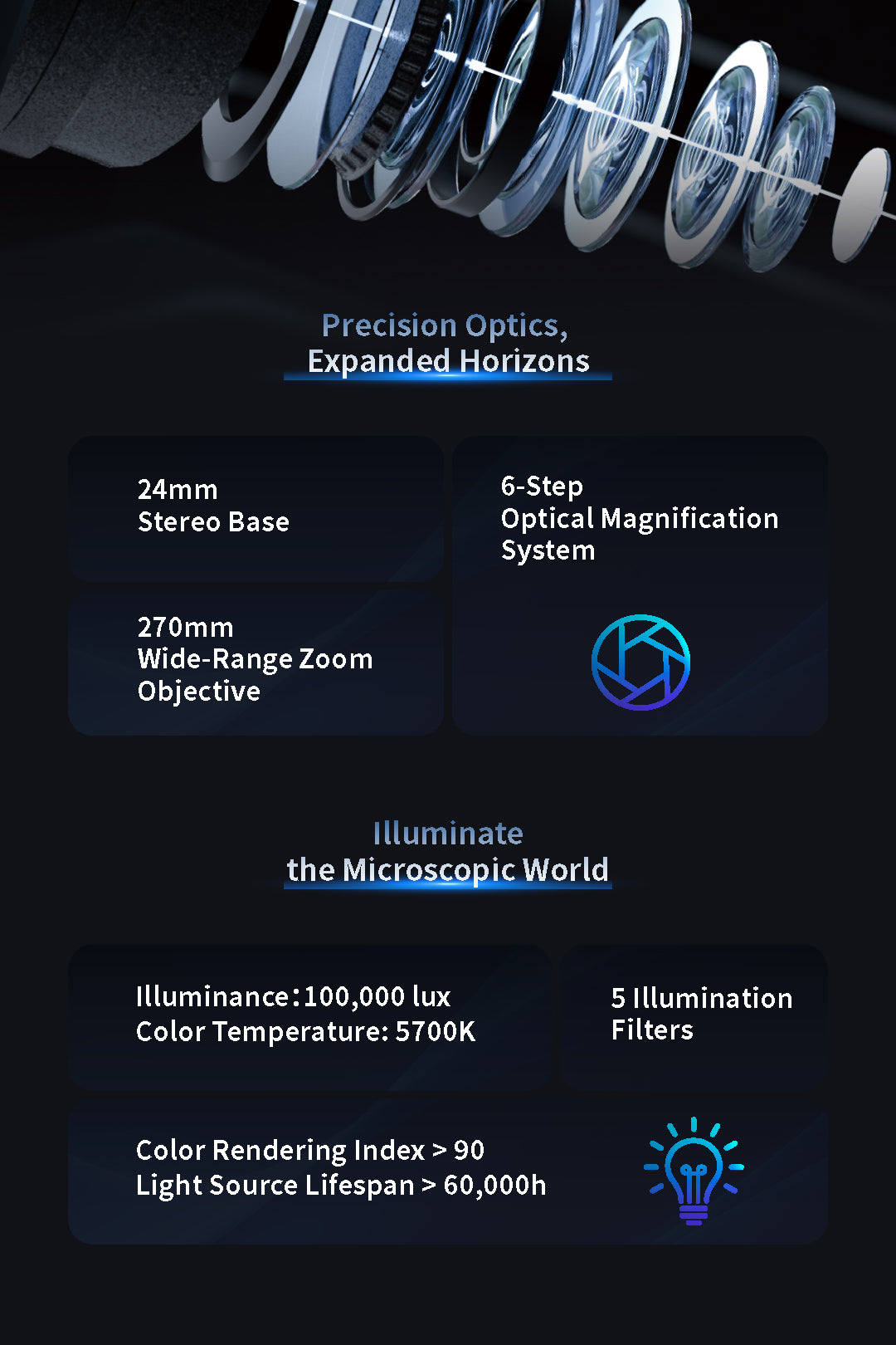 Apocromatic Optics: Corrects the refraction of different wavelengths of visible light (red, green, and blue), ensuring clear images without chromatic aberrations at every magnification level.